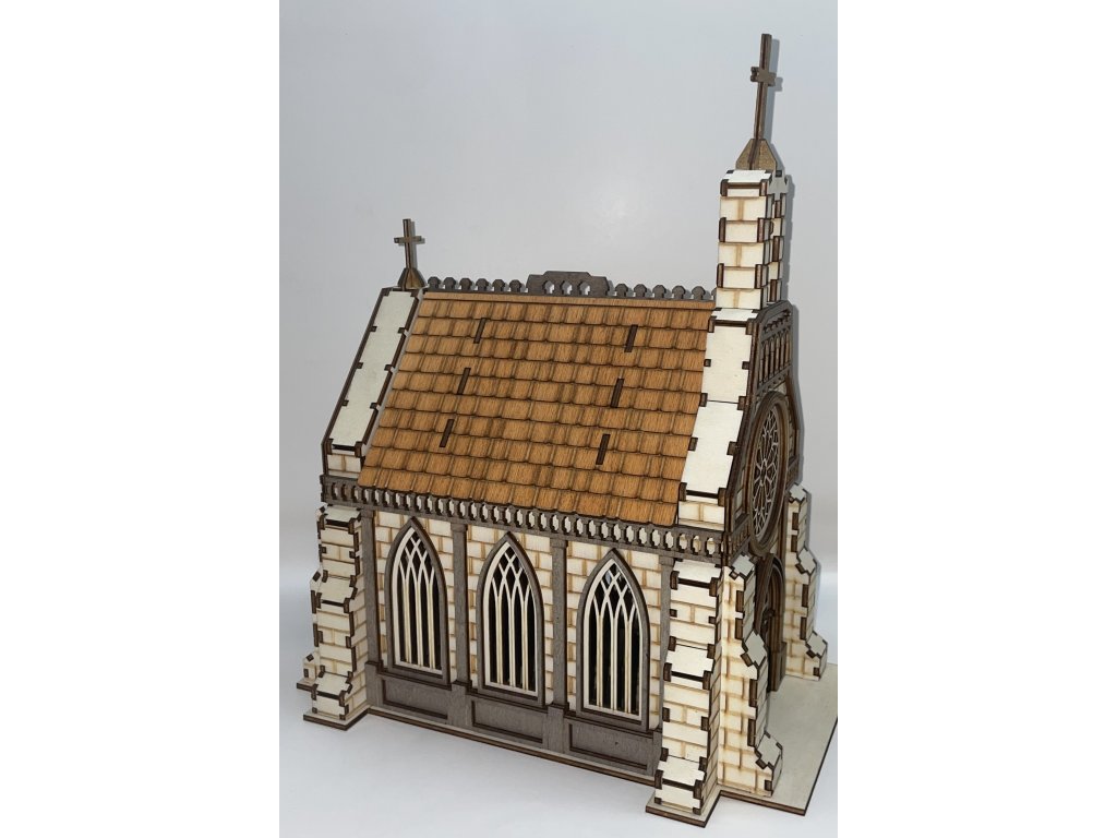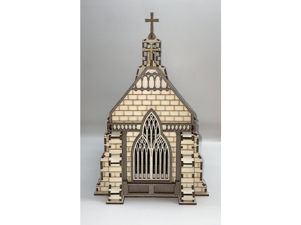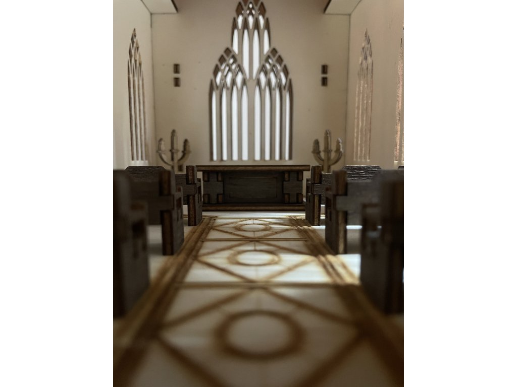 Detailní design kostela ze dřevěné překližky. Součástí je i vybavení vnitřního prostoru kostela lavicemi a oltářem se svícny.